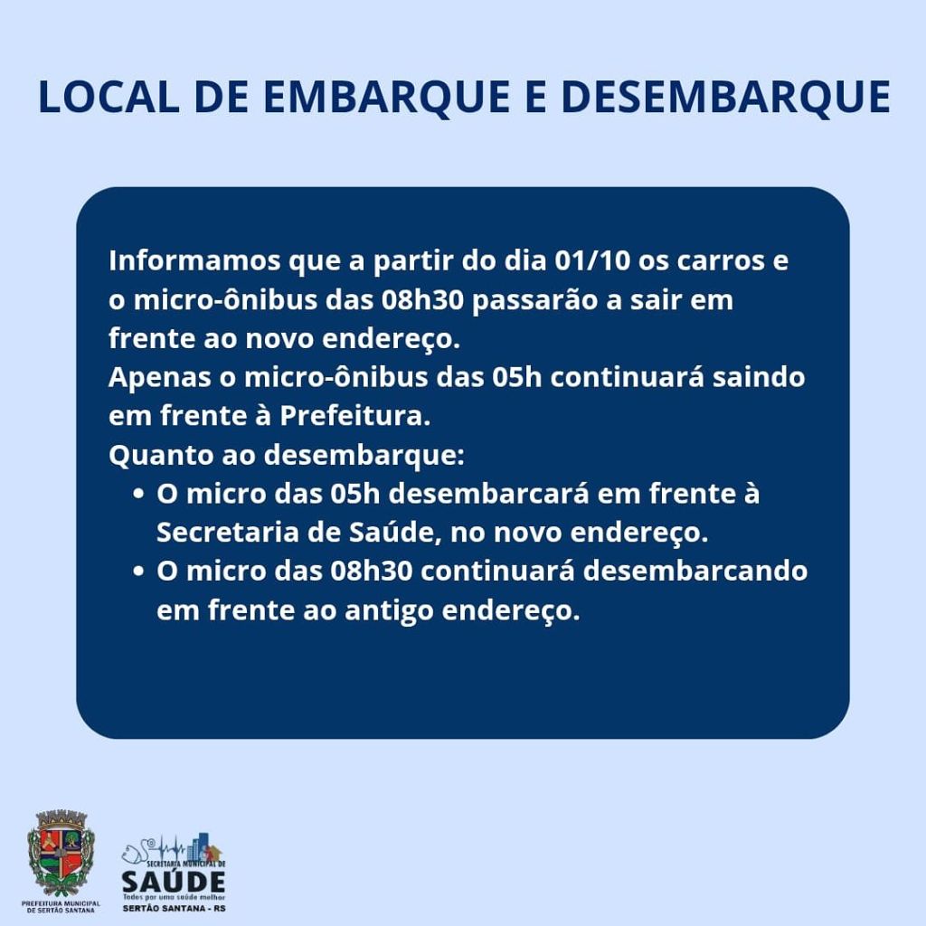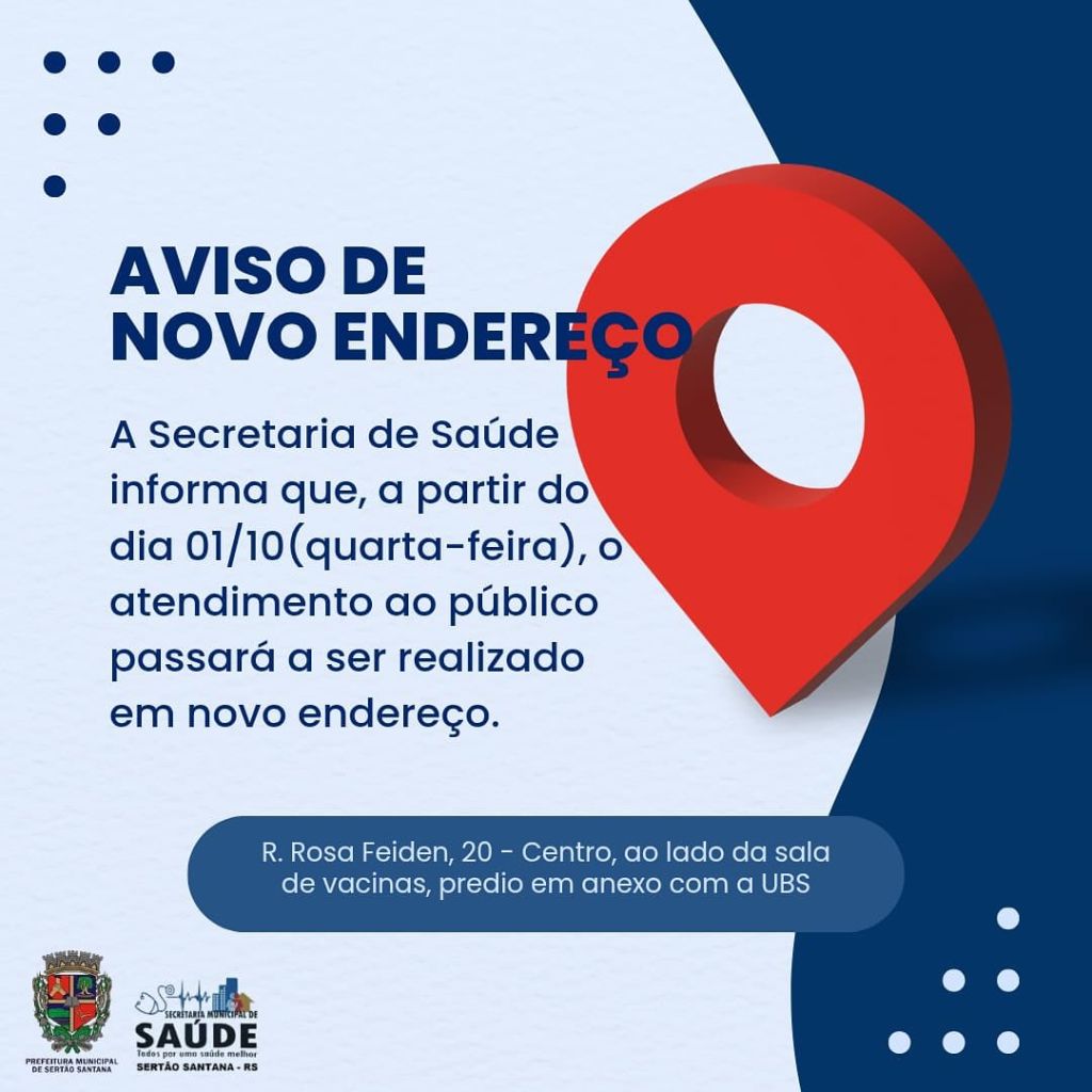 A Secretaria Municipal de Saúde informa à comunidade que, a partir desta quarta-feira, dia 1º de outubro, o atendimento ao público passará a ser realizado em um novo endereço.