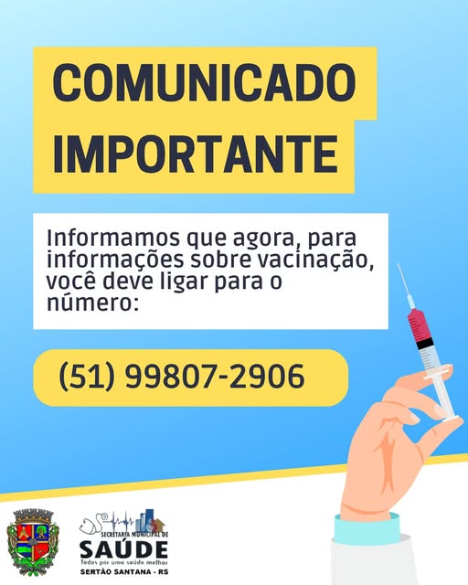 A Secretaria Municipal de Saúde de Sertão Santana informa à população que, a partir de agora, todas as informações relacionadas à vacinação devem ser obtidas pelo novo número de telefone: (51) 99807-2906.