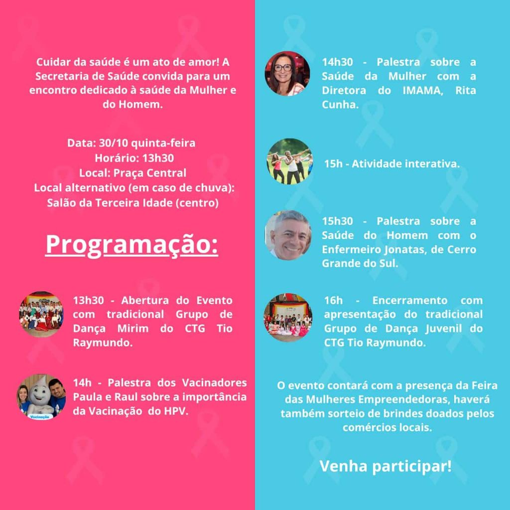 A tarde seguirá com uma palestra sobre Saúde da Mulher, ministrada por Rita Cunha, diretora do IMAMA, e uma atividade interativa para o público. Logo após, o enfermeiro Jonatas, de Cerro Grande do Sul, abordará o tema Saúde do Homem.