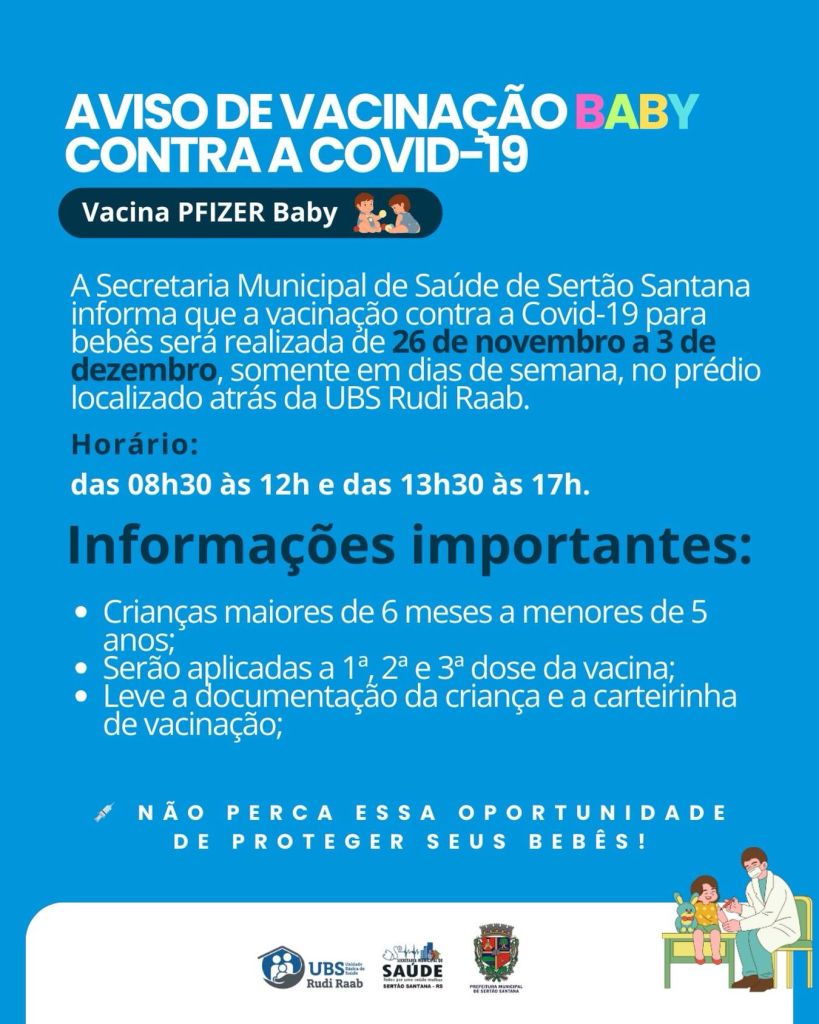 A Secretaria Municipal de Saúde de Sertão Santana iniciou a vacinação contra a Covid-19 para bebês e crianças pequenas. A aplicação da vacina Pfizer Baby ocorre entre os dias 26 de novembro e 3 de dezembro, exclusivamente em dias de semana, no prédio localizado atrás da UBS Rudi Raab.