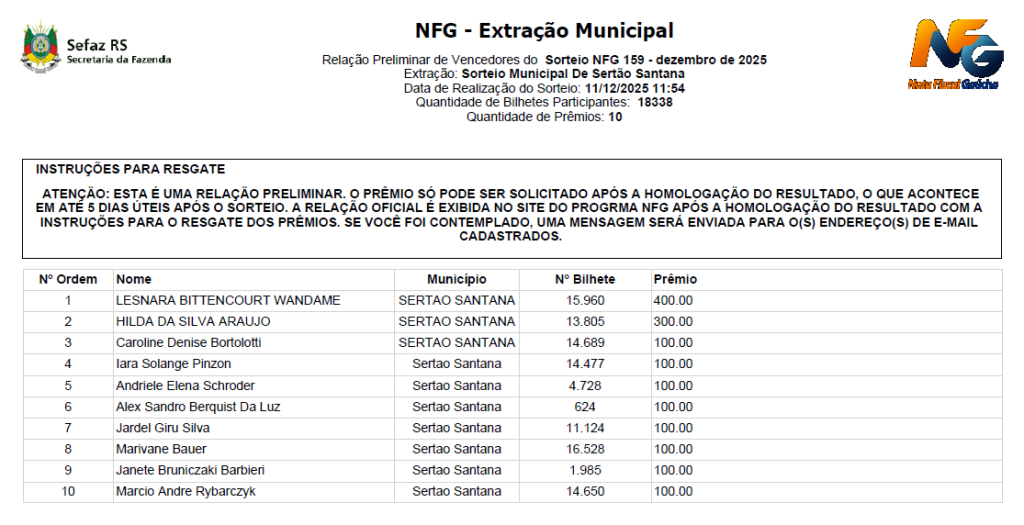 Ganhadores Nota Fiscal Gaucha - Segunda-feira, 22 de Dezembro de 2025