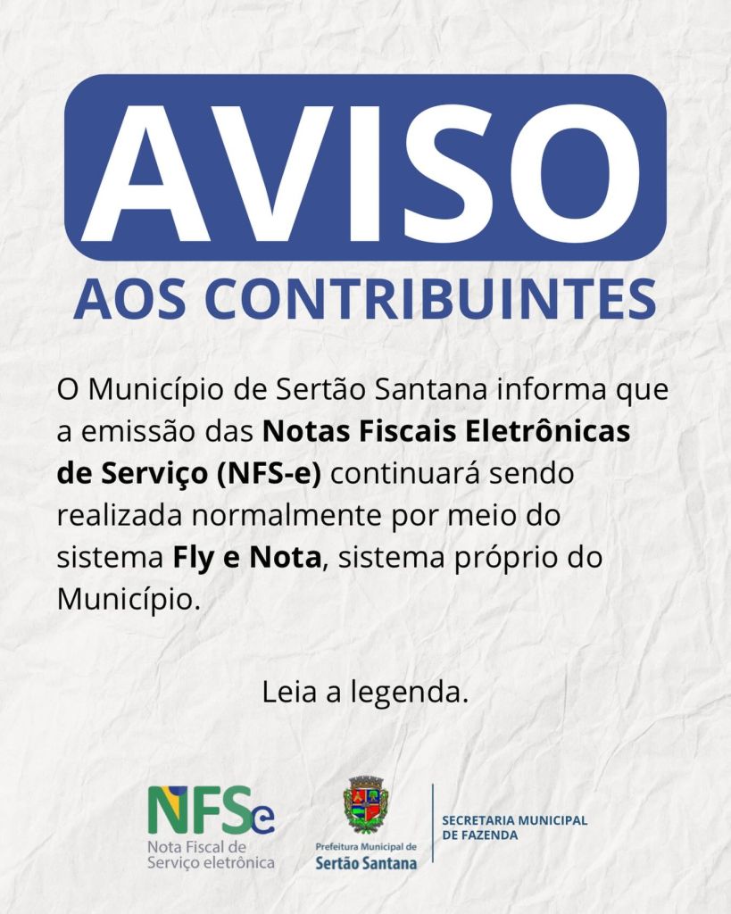 O Município de Sertão Santana informa aos contribuintes que a emissão das Notas Fiscais Eletrônicas de Serviço (NFS-e) continuará sendo realizada normalmente pelo sistema Fly-e Nota, plataforma oficial utilizada pela Prefeitura.