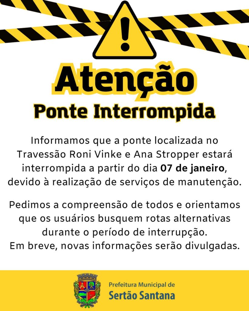 A Prefeitura Municipal de Sertão Santana informou que a ponte localizada no Travessão Roni Vinke e Ana Stropper será interditada a partir do dia 7 de janeiro para a realização de serviços de manutenção.