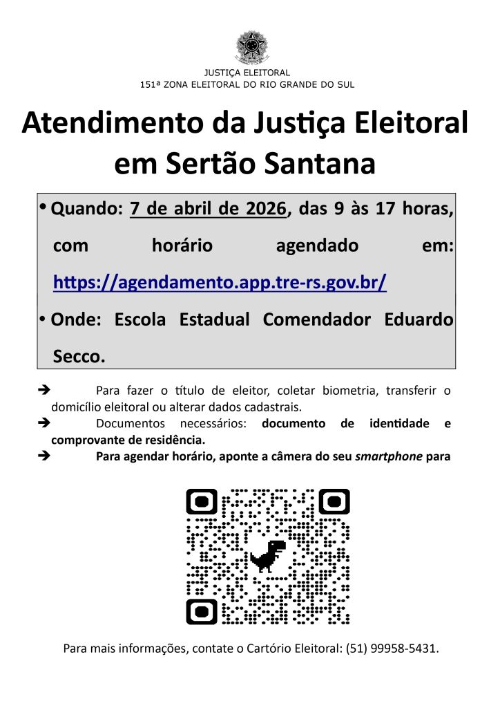 A Justiça Eleitoral do Brasil realizará atendimento presencial em Sertão Santana no próximo dia 7 de abril de 2026, das 9h às 17h, com agendamento prévio.