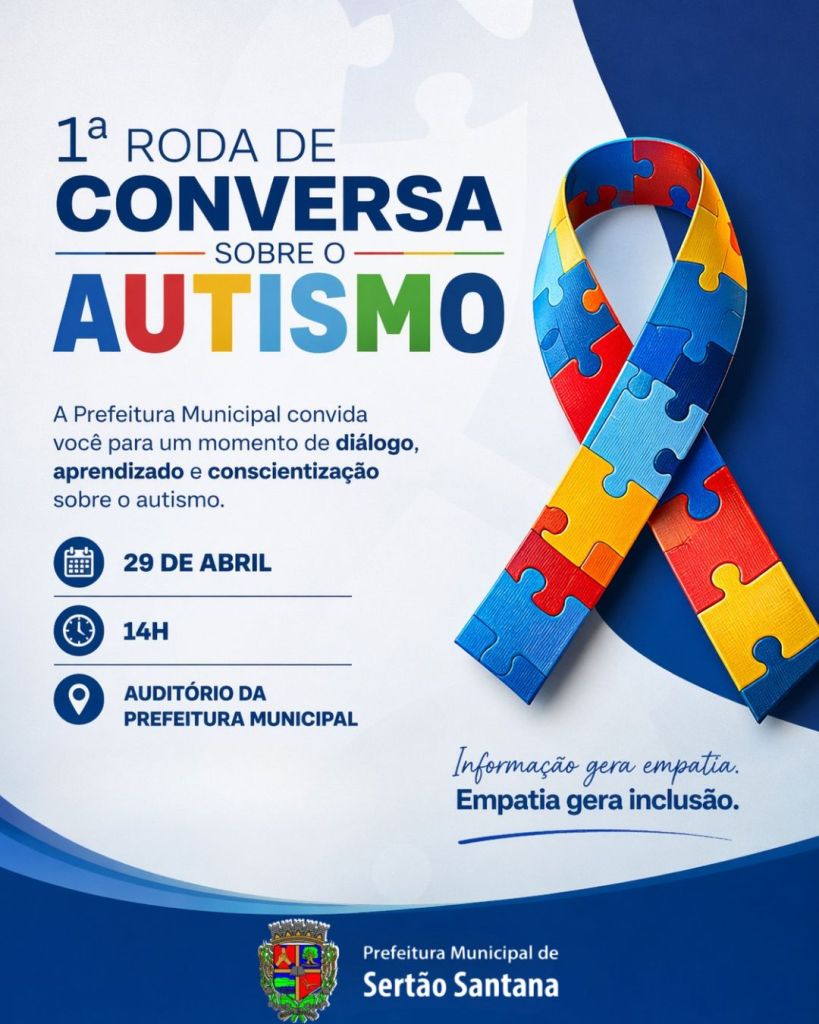 A Prefeitura Municipal de Sertão Santana realizará, no dia 29 de abril, às 14h, no auditório da prefeitura, a 1ª Roda de Conversa sobre o Autismo. A iniciativa tem como objetivo ampliar o conhecimento da população, incentivar o diálogo e fortalecer a conscientização sobre o tema.