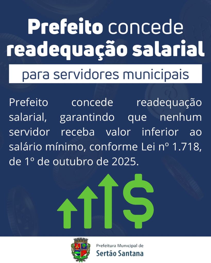 A Prefeitura de Sertão Santana anunciou a concessão de readequação salarial para os servidores municipais, conforme estabelece a Lei nº 1.718, de 1º de outubro de 2025.