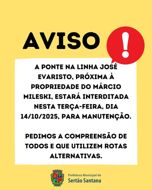 A Prefeitura Municipal de Sertão Santana informa que a ponte localizada na Linha José Evaristo, próxima à propriedade do senhor Márcio Mileski, estará interditada nesta terça-feira, dia 14 de outubro de 2025, para a realização de serviços de manutenção.