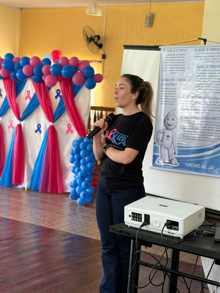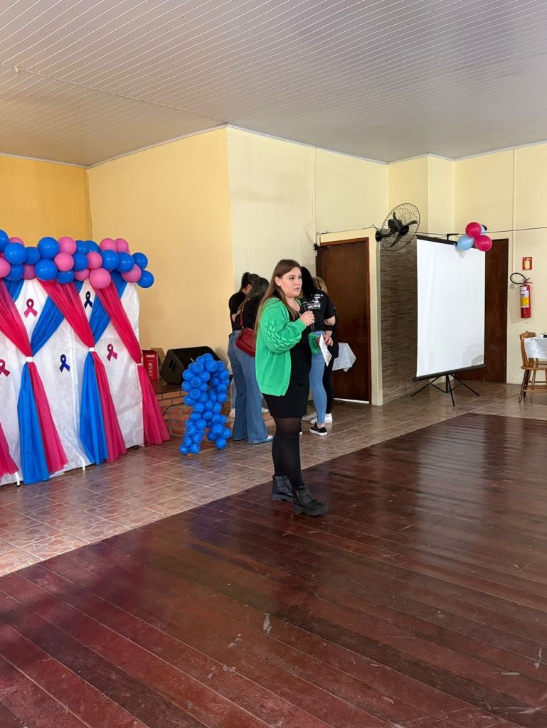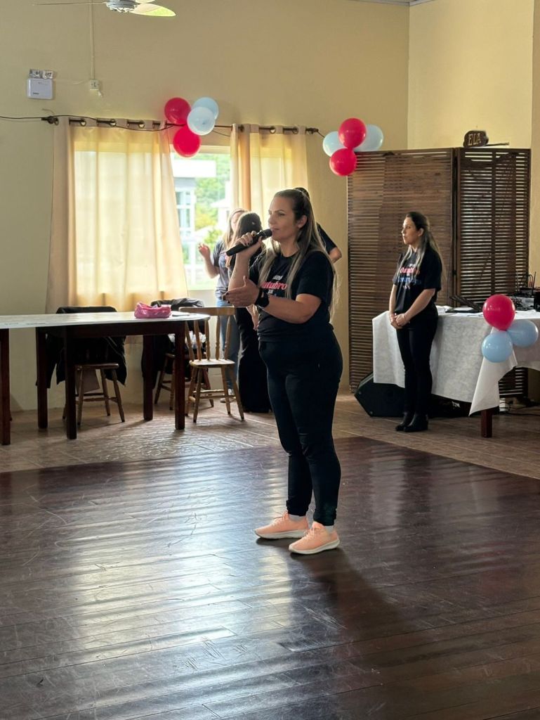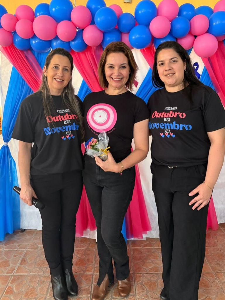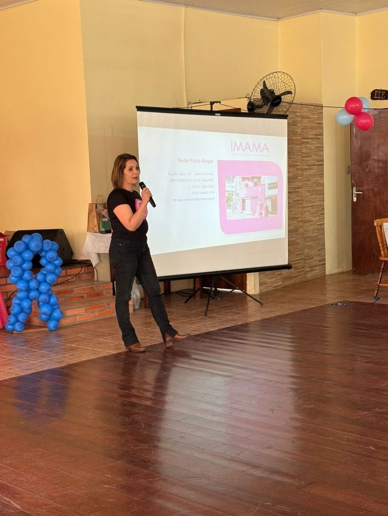 A palestrante Nina, representando o IMAMA, emocionou a todos ao compartilhar sua história de superação na luta contra o câncer de mama, reforçando a importância do autocuidado e dos exames preventivos.