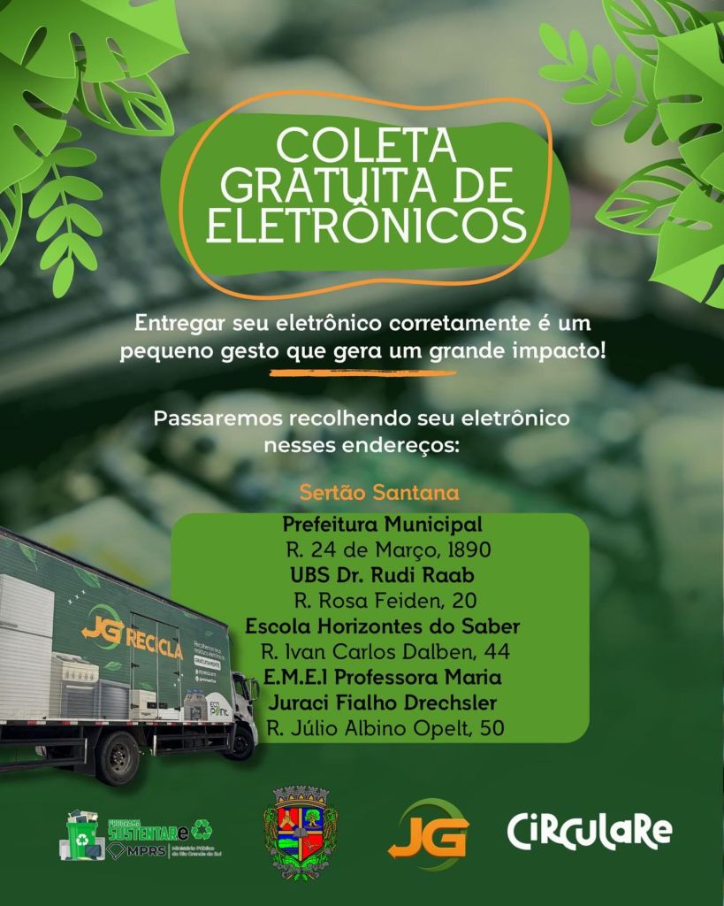 A população de Sertão Santana terá a oportunidade de descartar seus eletrônicos de forma adequada por meio da campanha de Coleta Gratuita de Eletrônicos, realizada em parceria com a JG Recicla e o programa Sustentar.