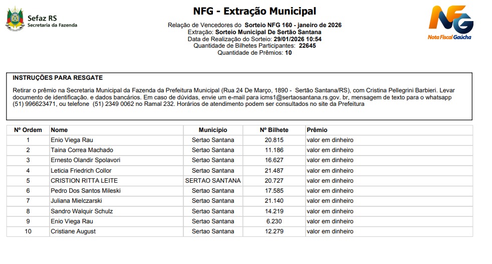 Ganhadores Nota Fiscal Gaucha - Segunda-feira, 23 de Fevereiro de 2026